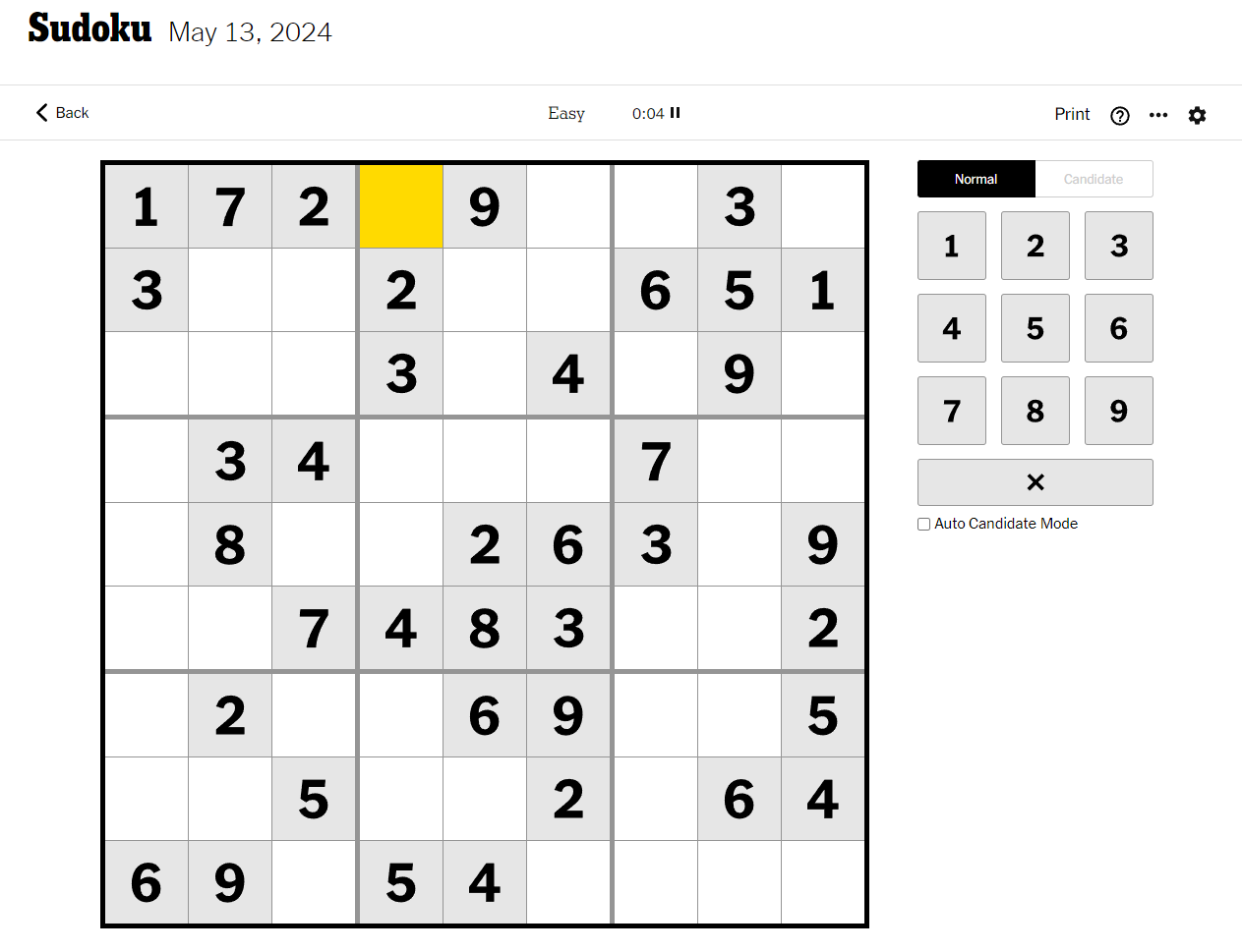 위에서 제공해드린 링크를 접속하셨다면 스도쿠 게임하기 스도쿠 무료게임을 플레이할 수 있는 뉴욕타임즈 퍼즐게임 페이지로 이동이 되었을 것입니다. nytimes는 미국 최고의 일간지 홈페이지이죠. 여기서는 스도쿠를 플레이할 수 있게 마련해두었습니다. easy, medium, hard 순으로 난이도가 달라집니다. 본인의 실력에 맞게 게임을 해보세요!