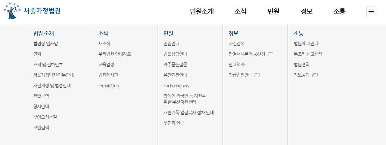 제공 드린 링크를 통해 서울가정법원 공식 홈페이지에 접속하면 사건 검색, 민원 안내, 각종 서류 발급, 상담 신청 등 다양한 서비스를 한 번에 이용할 수 있습니다. 이 포스팅은 일단은 서울 기준으로 설명드릴 것이지만, 실제로 대한민국에는 서울 외에도 인천, 부산, 대구, 광주, 대전, 울산, 수원 등 주요 도시에 가정법원이 설치되어 있습니다. 알려드린 링크를 통해 접속하시면, "각급 법원"이라는 곳의 "법원명"에 "가정법원"을 입력하여 검색하면 전국의 가정법원과 지원들의 목록을 확인하실 수 있습니다.