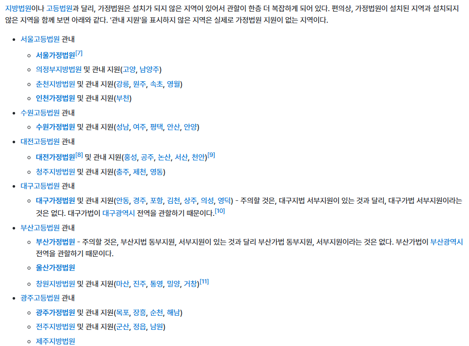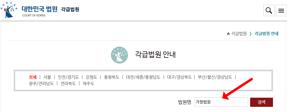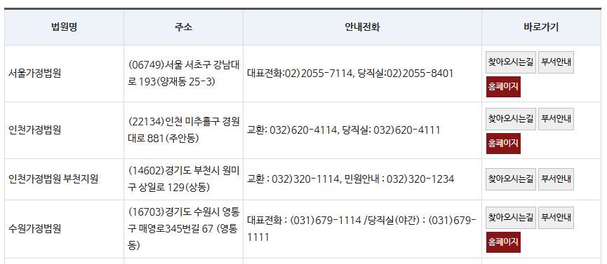 가정법원 홈페이지 바로가기로 전국 가정법원 현황을 확인해보면, 모든 시군구에 가정법원이 있는 것은 아닙니다. 가정법원이 설치되지 않은 지역에서는 해당 지방법원이 가정법원 업무를 담당하게 되어 있는데요. 예를 들어 강원, 충북, 충남, 전북, 경북, 경남 등 일부 지역은 지방법원 또는 지방법원 지원에서 이혼, 양육, 입양 등 가사사건을 처리하게 됩니다. 따라서 자신의 주소지 관할 법원을 미리 확인하시는 것이 중요하다고 생각합니다.