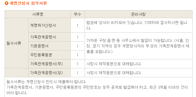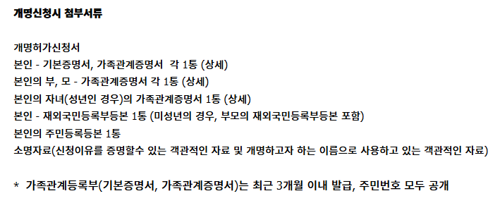 개명신청 서류 목록