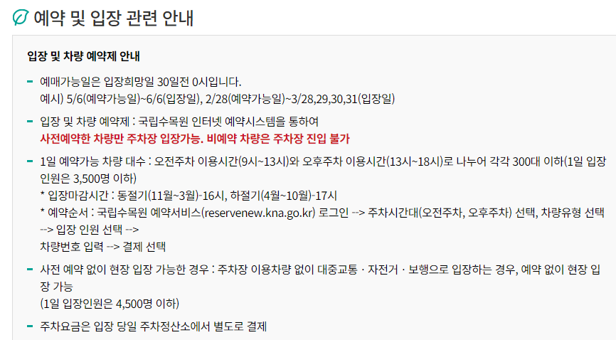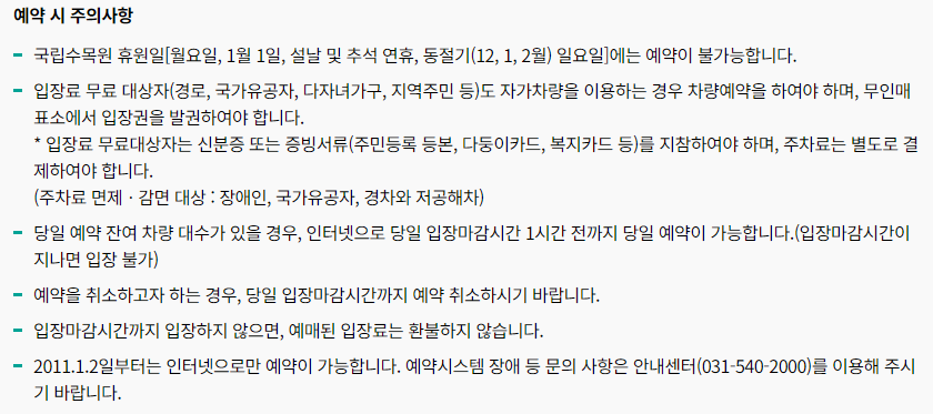 광릉수목원 예약하기 시 몇 가지 주의사항이 있습니다. 먼저, 수목원은 매주 월요일과 명절 연휴, 그리고 동절기 일요일에는 휴관이라는 점을 유의하셔야 합니다. 또한, 1일 입장 인원이 제한되어 있어 인기 있는 날짜는 빨리 마감될 수 있습니다. 예약 후 방문이 어려워진 경우, 다른 분들을 위해 꼭 취소해 주시는 것이 좋습니다. 예약 시 입력한 차량 정보와 실제 방문 차량이 다르면 입장이 거부될 수 있으니 주의해야 합니다!