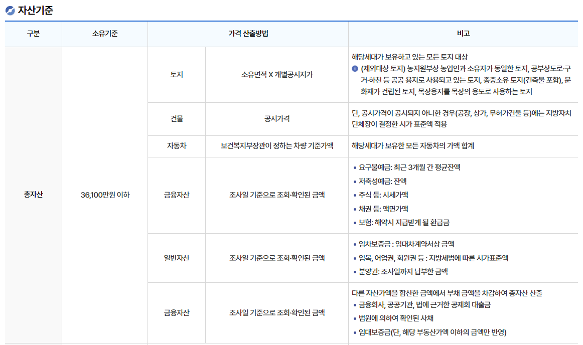 - 총자산이 36,100만 원 이하이며, 자동차는 보건복지부 장관이 정하는 차량 기준 가액 3,683만 원 이하의 가치를 지녀야 합니다.