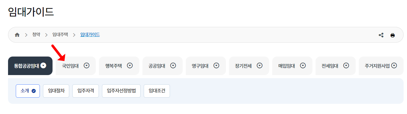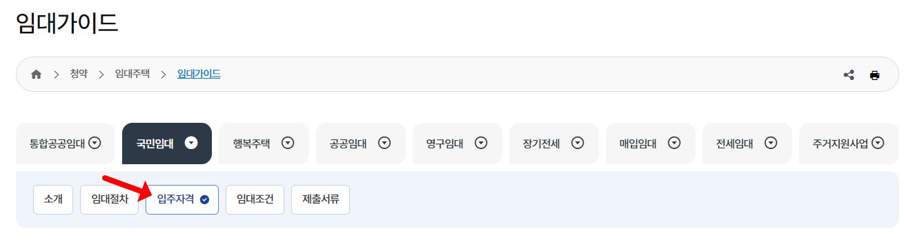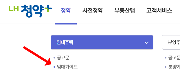 국민임대아파트 분양공고 입주조건 확인하는 방법을 살펴보겠습니다. 메인 홈페이지 화면에서 '청약'을 누르고 '임대주택' > '임대가이드'를 클릭합니다. 그리고 국민임대를 클릭한 뒤, 입주자격을 살펴보시면 됩니다. 아래는 간단히 요약을 해보도록 하겠습니다.