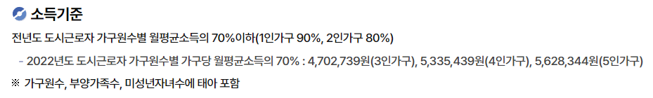 - 국민임대아파트 분양공고 입주조건에는 소득 기준이 존재합니다. 가구원 수별로 전년도 도시 근로자의 월 평균 소득의 일정 비율 이하이어야 합니다. 예를 들어, 1인 가구는 90%, 2인 가구는 80% 등으로 소득 한도가 설정됩니다.