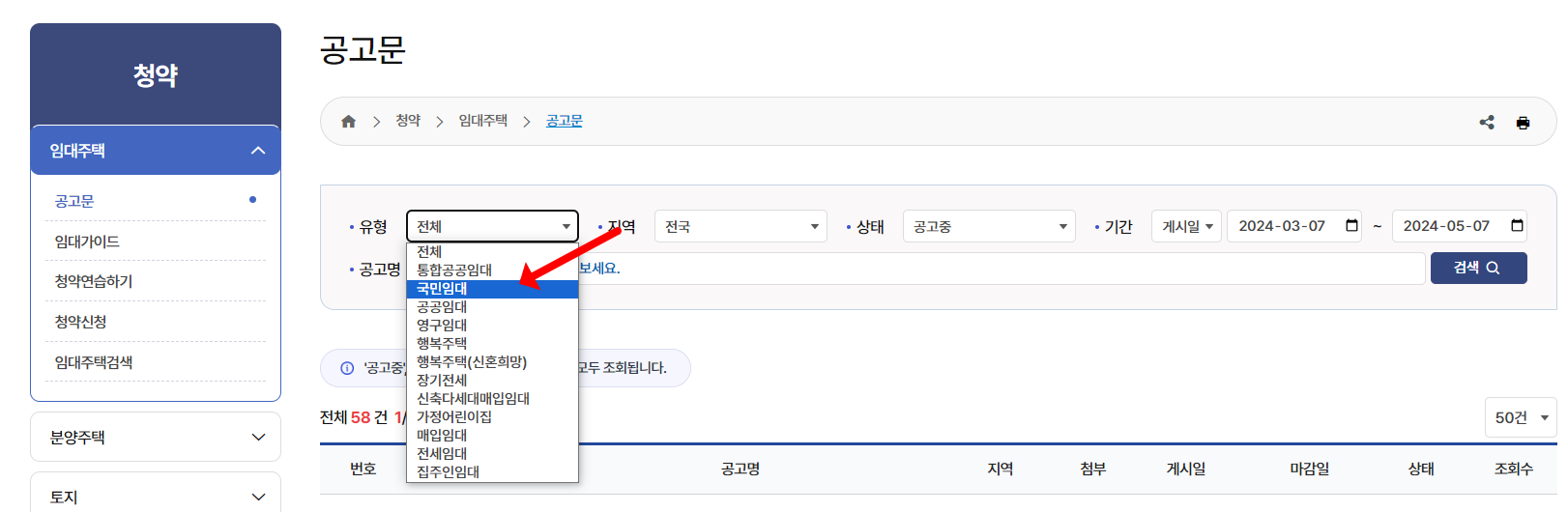 국민임대아파트 분양공고 입주조건을 확인하기 위해서는 위 링크를 통해 접속하시어 Lh 청약센터 홈페이지를 열어야합니다. 먼저 분양공고를 확인하는 방법을 알아보겠습니다. 홈페이지 메인화면에 '임대주택'을 클릭하면 "공고문"을 확인할 수 있는 페이지로 이동됩니다. 여기서 유형을 "국민임대"로 변경해주고, 기간 등을 설정한 뒤 검색을 누르면 모든 공고가 조회됩니다.