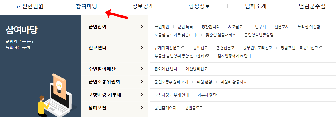 남해군청 홈페이지 바로가기를 통해 접속할 수 있는 '참여마당'은 군민들의 의견을 수렴하고 소통하는 공간입니다. 여기서는 군정에 대한 제안, 불편사항 신고, 칭찬하기 등 다양한 방식으로 의견을 개진할 수 있어요. 또한 "열린군수실"에 들어가게되면 '군수에게 바란다'라는 코너가 있습니다. 이를 통해 군수와 직접 소통할 수 있는 기회도 제공됩니다. 이러한 소통 창구를 통해 군민들의 목소리가 군정에 반영되고, 더 나은 남해군을 만들어가는 데 기여할 수 있을 것 같습니다.