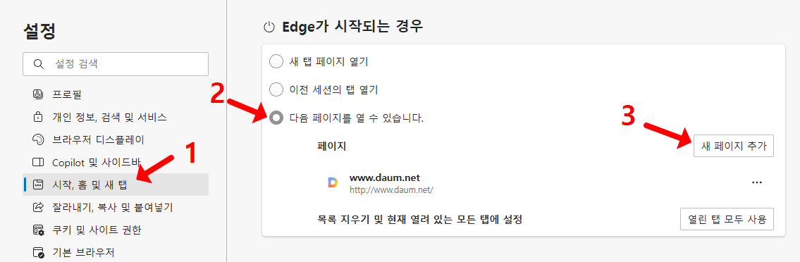 마이크로소프트 엣지에서도 네이버 시작페이지로 설정하기 바꾸기가 가능합니다. 엣지를 실행한 후, 오른쪽 상단의 메뉴(⋯)를 클릭하고 '설정'으로 들어갑니다. 그리고 '시작, 홈페이지 및 새 탭' 섹션을 먼저 누르고, "Edge가 시작되는 경우"에서 "다음 페이지를 열수 있습니다" 를 클릭 하신 다음, "새 페이지 추가"를 누르세요. 그리고 네이버 주소를 입력하세요. 이렇게 하면 엣지를 실행할 때마다 네이버가 자동으로 열리게 됩니다. 정말 쉽지요?