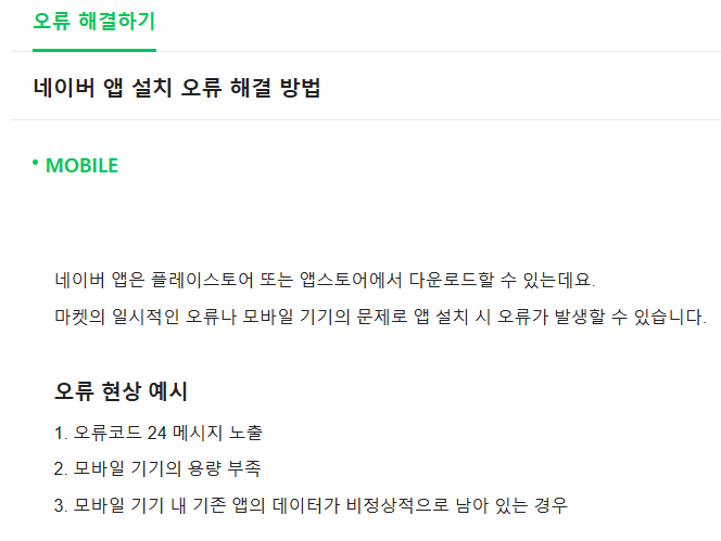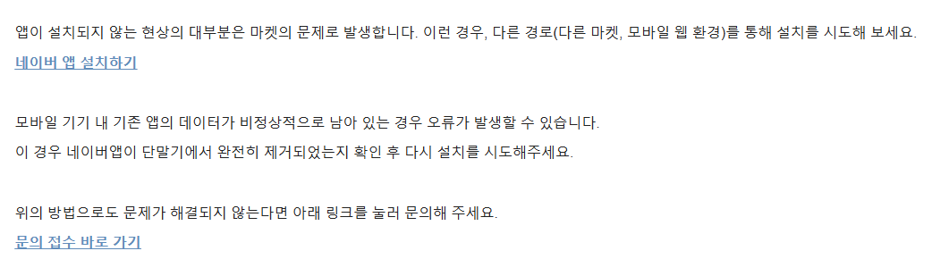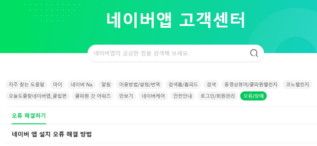 네이버 앱 설치 다운로드 방법을 따라 하다 보면 간혹 오류가 발생할 수 있는데요. 이런 경우 대부분 마켓의 일시적인 오류나 모바일 기기의 문제일 가능성이 높습니다. 먼저 Wi-Fi나 모바일 데이터 연결을 확인해 보세요. 연결에 문제가 없다면 스마트폰을 재부팅하거나 앱 스토어 캐시를 삭제해 보는 것도 좋은 방법이에요. 그래도 문제가 해결되지 않는다면 네이버 고객센터에 접속해보시면 여러 장애 및 오류에 대해 도움을 받을 수 있습니다. 아래를 참고하세요.