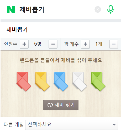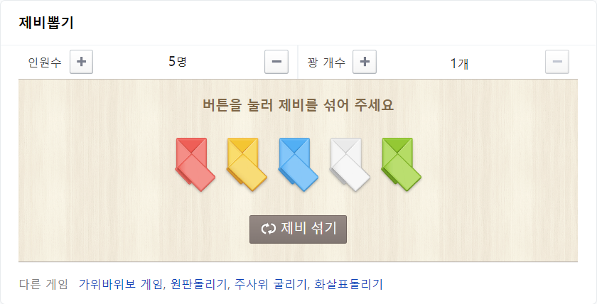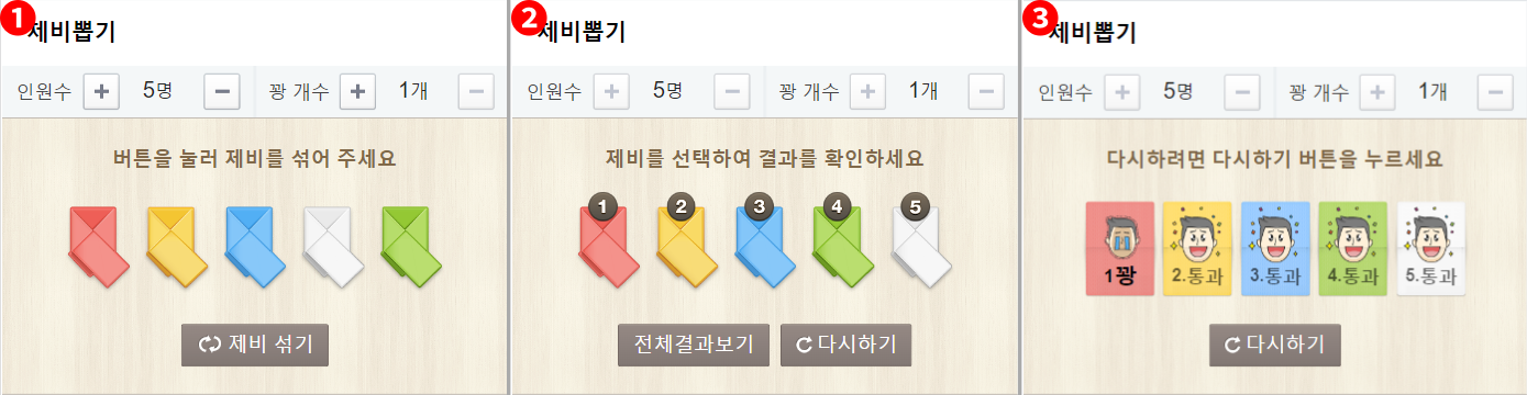 - 인원수와 꽝 개수를 설정한 뒤 "제비 섞기" 버튼을 클릭합니다. (스마트폰에서는 폰을 흔들어도 제비가 섞입니다)