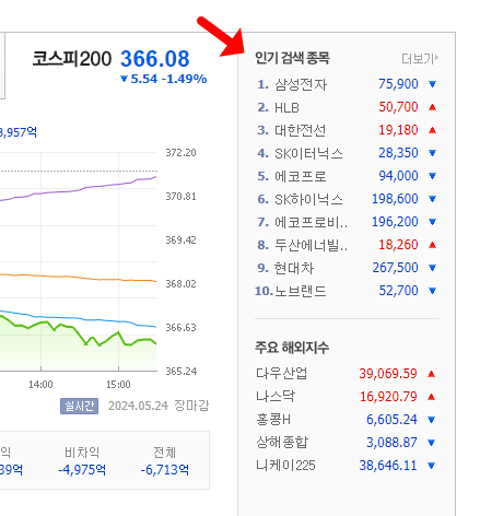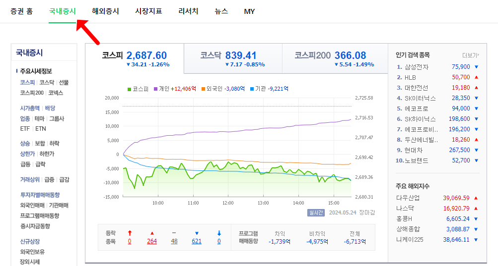 홈페이지의 메뉴 중 "국내증시"를 클릭하면 한국의 주식 시장에 대한 정보를 한눈에 살펴보실 수 있습니다. 네이버 증권 바로가기 사이트의 장점 중 하나로, 실시간 주식 가격, 시장 동향, 주요 지수(예: 코스피, 코스닥, 코스피200 등)의 변화, 거래량과 같은 시장 데이터를 한눈에 보기 쉽도록 그래프 형태로 제공되고 있습니다. 또한 각 종목의 상세 정보, 분석 리포트 및 주가 차트도 접근 가능합니다. 우측 "인기 검색 종목"에는 국장에서 가장 핫한 종목을 확인할 수 있습니다.
