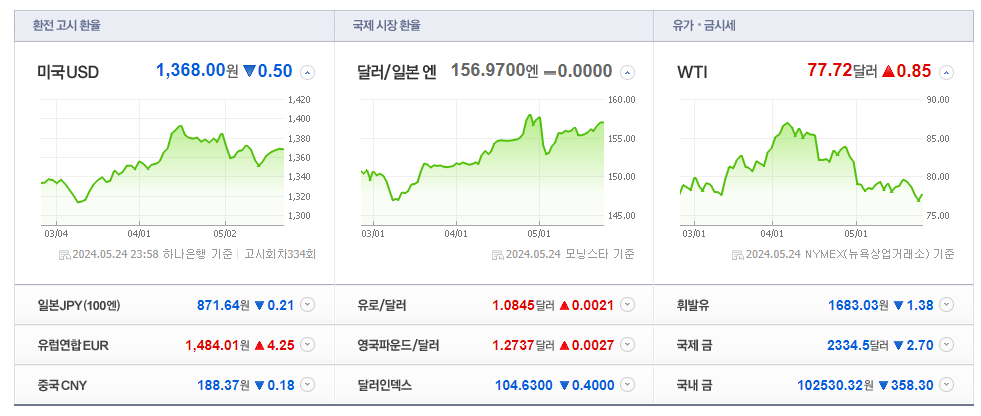 네이버 증권 바로가기의 시장지표 메뉴는 다양한 경제 지표를 통해 금리, 환율, 원자재 가격 등 글로벌 경제 상황을 분석하는데 필요한 정보를 제공합니다. 예를 들어, 금리 정보는 통화정책의 변화와 시장의 기대를 반영하여 투자 결정에 중요한 기준을 제공합니다. 또한, 환율 정보는 글로벌 통화 강세 및 약세 추세를 파악하는 데 중요하며, 원자재 가격 변동은 경제 전반에 영향을 미칠 수 있는 중요한 요소입니다. 가장 아래에는 "환율계산기"가 존재합니다.