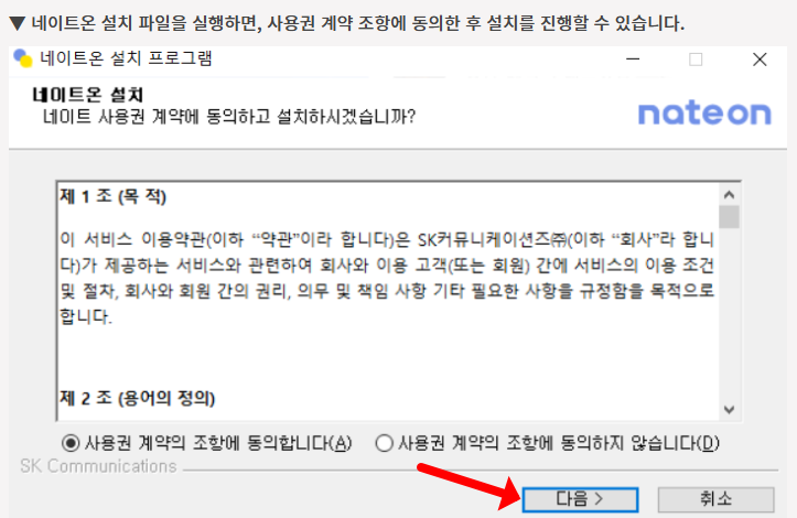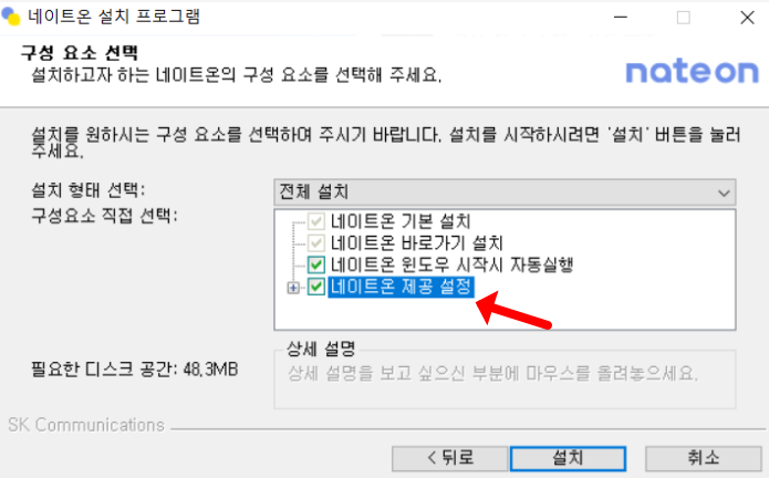 프로그램을 다운로드 하셨다면 그 후 설치 과정은 매우 간단합니다. 설치 파일을 실행하면 사용권 약관 동의 화면이 나오는데요. 내용을 확인하고 동의하시면 됩니다. 그 다음 설치 구성요소 선택 화면에서는 기본 설정으로 두시는 것이 좋습니다. 다만, '네이트온 제공 설정'은 체크를 해제하는 것이 좋아요. 이 옵션을 체크하면 웹 브라우저의 시작 페이지가 네이트로 변경되고, 작업 표시줄에 바로가기가 생성되거든요. 설치가 완료되면 네이트온을 실행할 수 있습니다.