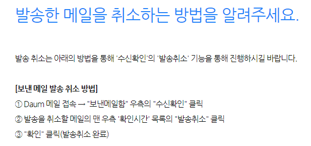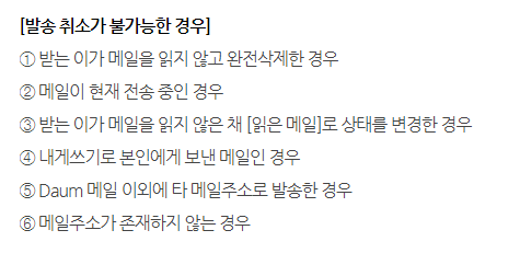 다음메일 발송취소 방법을 따라하였는데도 취소가 안되는 경우가 생길 수 있습니다. 다음 고객센터에서는 이 상황에 대하여 7가지 경우의 수를 나열하여 설명하고 있습니다. 아래를 참고하세요!