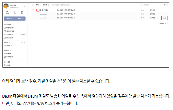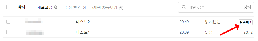- 수신자 측에서 메일을 열람하지 않았을 경우에만 발송취소가 가능함