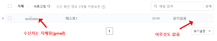다음메일 발송취소 방법을 설명드리기 위해 테스트를 진행해보았습니다. '수신확인' 버튼을 눌러 들어갔을 때 '읽지않음' 상태여도 아무런 표시가 되어있지 않습니다. 같은 다음이메일이었다면 읽지않음 옆에 무언가 버튼이 생기게 됩니다. 이를 보여드리기 위해 아래에서 알려드리겠습니다.