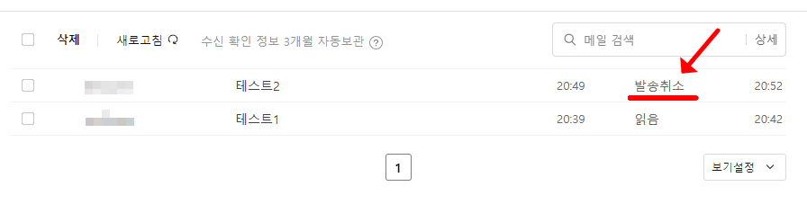 새로고침을 하신 다음 다시 눌러보면 정상적으로 진행이 되실 것입니다. 수신확인 상태 내역에서 발송취소가 정상적으로 된 것을 볼 수 있습니다.