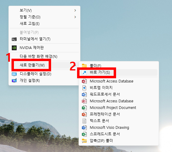 - 바탕화면 우클릭: 바탕화면 빈 공간에서 우클릭하여 '새로 만들기' > '바로가기'를 선택합니다.
