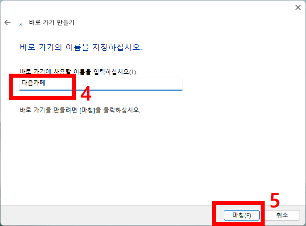 - 이름 지정: 원하는 이름을 입력한 후 '마침' 버튼을 클릭하면 바탕화면에 바로가기가 생성됩니다.