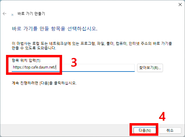 - 주소 입력: 복사한 URL을 붙여넣고 '다음' 버튼을 클릭합니다.