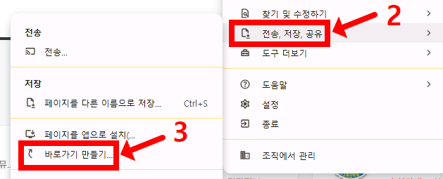- 바로가기 만들기: 오른쪽 상단의 점 세 개 아이콘을 클릭한 후, '전송, 저장, 공유'를 선택하고 '바로가기 만들기'를 클릭합니다.