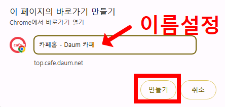 - 이름 지정: 원하는 이름을 입력한 후 '만들기' 버튼을 누르면 바탕화면에 바로가기 아이콘이 생성됩니다.
