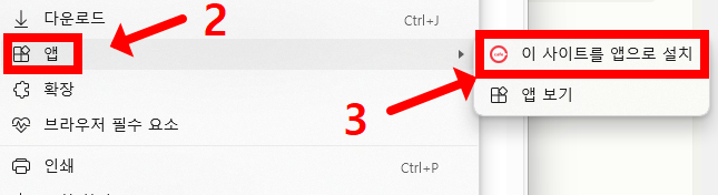 - 바로가기 설정: 오른쪽 상단의 점 세 개 아이콘을 클릭한 후, '앱' 메뉴에서 '이 사이트를 앱으로 설치'를 선택합니다.