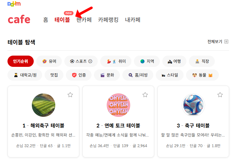 먼저 바로가기 하시려면, 다음 포털 사이트에 접속하신 뒤, 상단 메뉴에서 '카페' 탭을 클릭하면 됩니다. 이렇게 하면 다음카페 메인 페이지로 이동하게 되죠. 여기서 원하는 카페를 검색하거나 테이블이라는 메뉴를 통해 카테고리별 분류를 할 수 있습니다. 자주 방문하는 카페가 있다면, 해당 카페 페이지에서 브라우저의 '즐겨찾기' 버튼을 클릭하여 추가해두면 다음번부터는 더욱 빠르게 접속할 수 있어요. 아래의 링크를 통해 다음카페로 이동해보시기 바랍니다.