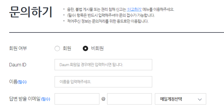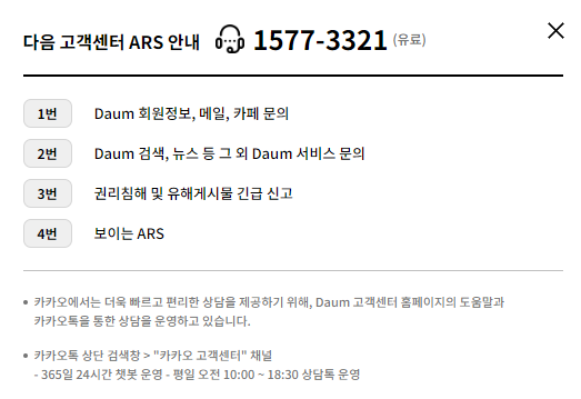 - 회원 정보, 메일, 카페 관련 문의: 다음의 메일이나 카페 서비스, 또는 회원 정보에 관한 문의사항은 1번을 누르시면 됩니다.