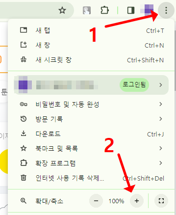 (= Ctrl 과 + 를 같이 누르거나, Ctrl 을 누른채로 마우스 휠을 올려도 확대됩니다.) - 원하는 만큼의 배율로 높인 후 다음 포털을 사용합니다.
