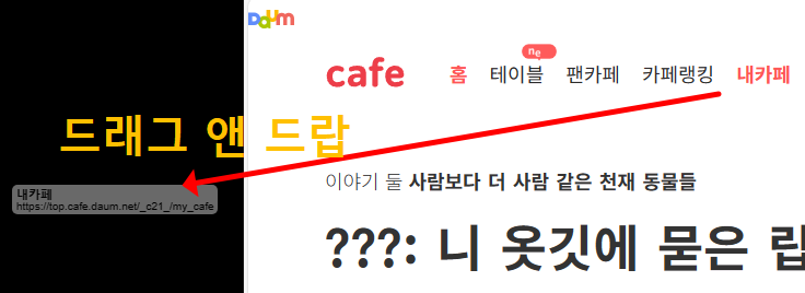 윈도우를 깔게되면 기본적으로 설치되어있는 마이크로소프트의 기본 브라우저입니다. 이것을 이용하시면 크롬을 평소에 사용하시는 분들과는 설정이 좀 달라서 불편하실 수 있는데, 바로가기 만드는 것에 한해서는 더 쉽습니다. '다음 내카페' 글자를 클릭 후 바탕화면으로 드래그 앤 드랍을 하시게 되면 너무 쉽게 만들어지게 생기게 됩니다. 정말 간편하죠? (위 사진에서 아이콘이 이상한 이유는 현재 컴퓨터 기본설정이 엣지가 아니기 때문입니다.)