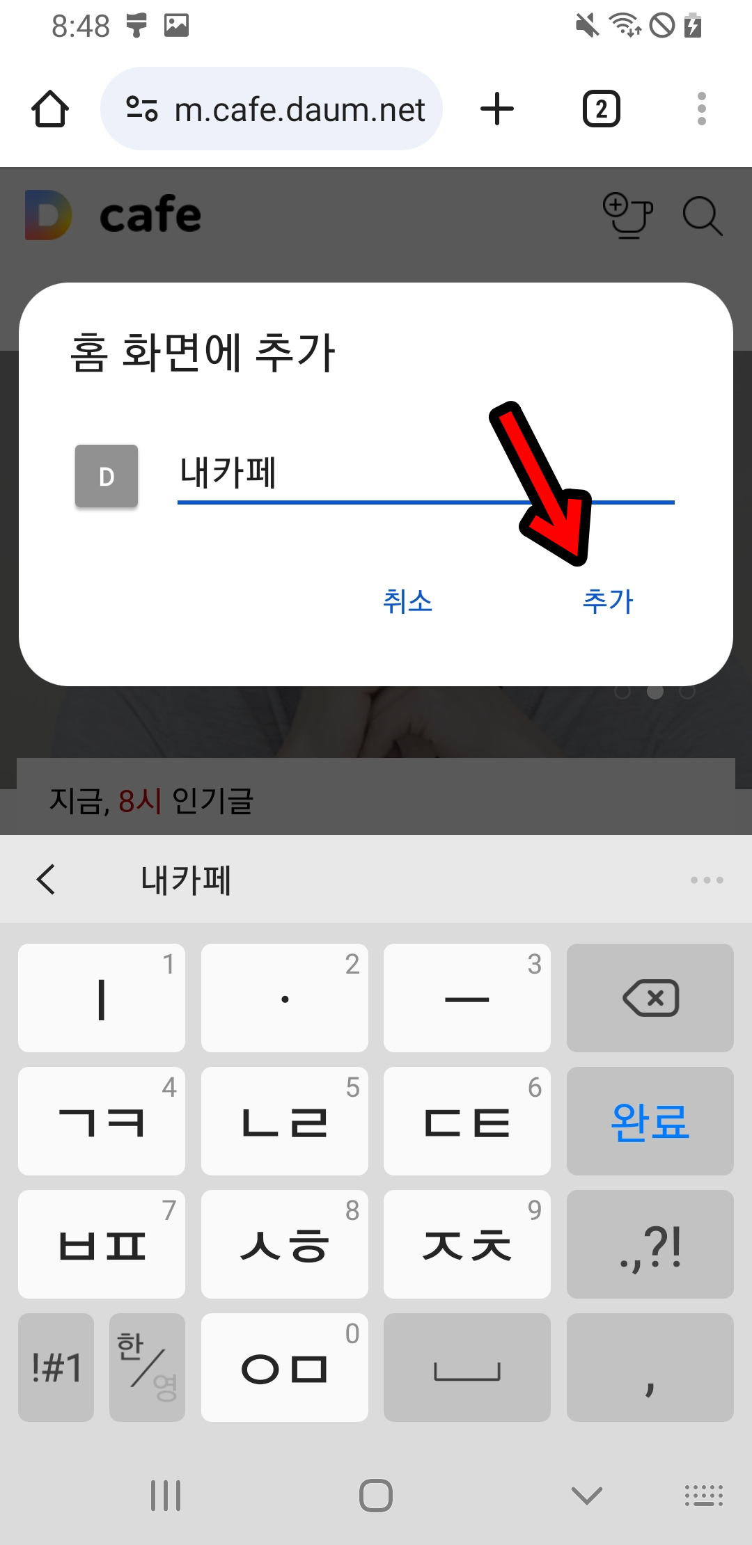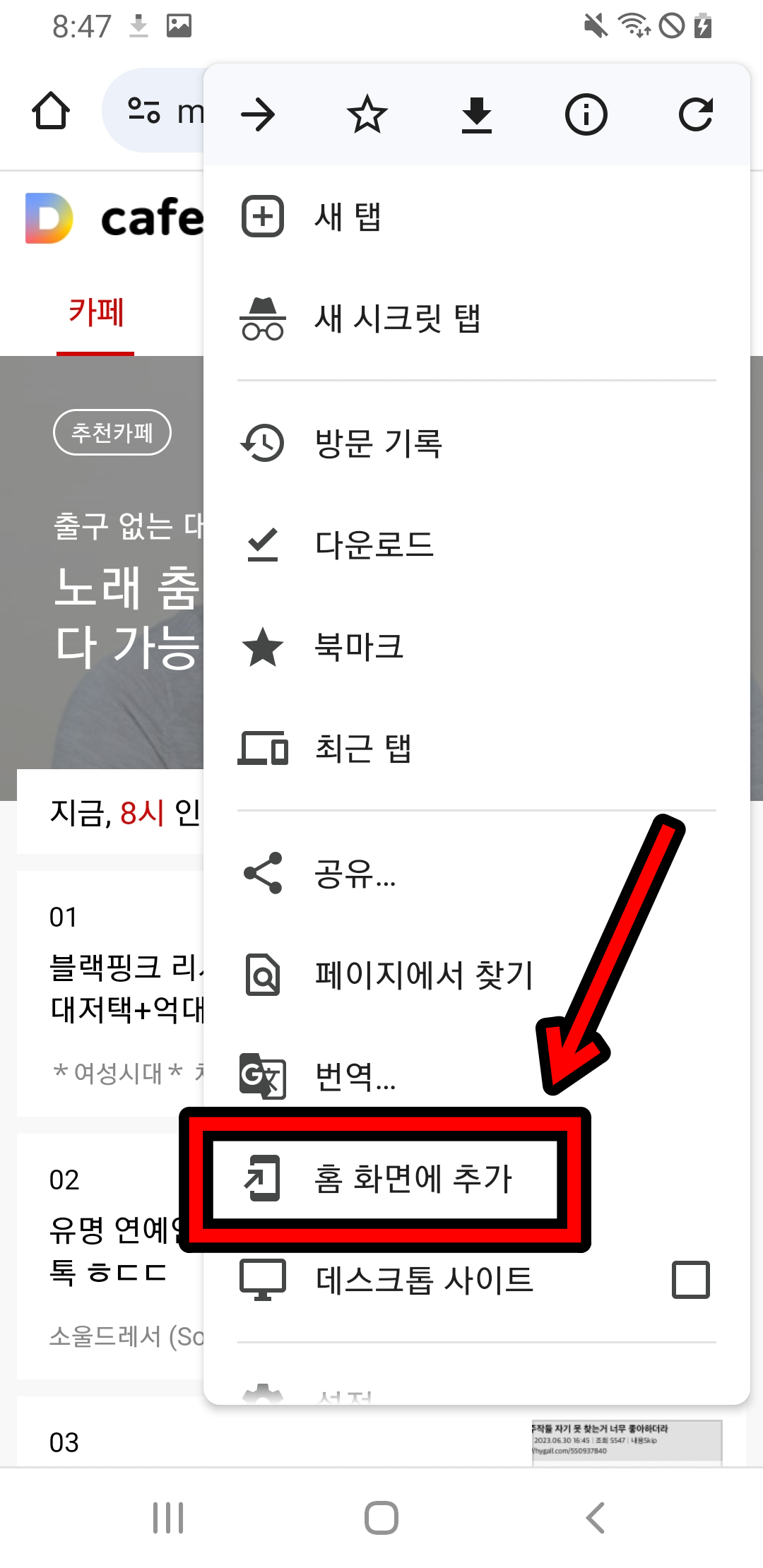 '홈 화면에 추가' 라는 것이 있습니다. 이것을 눌러주시면 휴대폰 메인화면에 1x1 크기의 D라고 적힌 작은 앱이 추가됩니다.