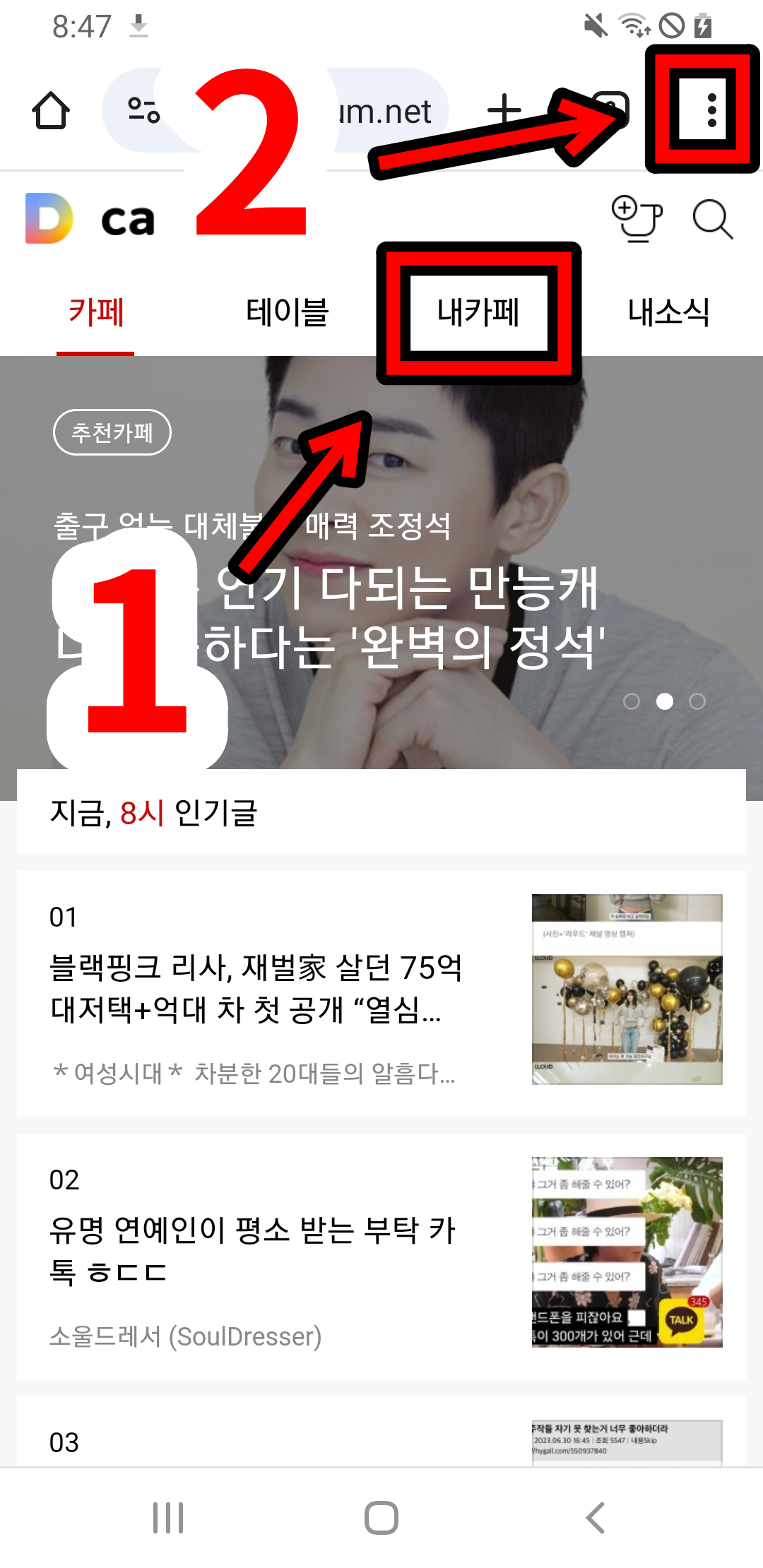 먼저 인터넷 홈화면에 기본적으로 깔려져 있는 앱을 클릭하세요. 그리고 검색창에 m.cafe.daum.net 입력해서 들어가신 '다음 내카페'를 클릭해서 이동해주세요. 그리고 우측상단 점 3개를 눌러서 설정을 열어주세요.