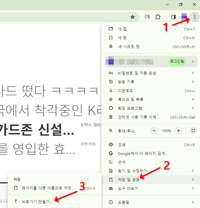 더 획기적인 방법이 있습니다. 브라우저의 오른쪽 상단 X(닫기) 표시 바로 아래에 보면 '더보기' 버튼이 있습니다. 점 세개로 이루어진 아이콘인데요. 이것을 클릭하신 뒤 아래로 내려가 '저장 및 공유'를 클릭하면 '바로가기 만들기'라는 것이 있습니다. 이것을 클릭하고 '만들기'를 누르시면 바로 바탕화면에 바로가기가 생성됩니다. 아이콘도 다음카페 아이콘으로 설정되어서 눈에 잘보인다는 장점이 있습니다.