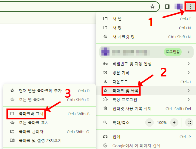 만약 북마크가 보이지 않는다면 위 사진을 따라하세요. 점 세개 아이콘을 클릭 후 '북마크 및 목록'을 클릭하여 "북마크바 표시(Ctrl+Shift+B)를 클릭합니다. 그러면 주소창 아래에 즐겨찾기가 항상 표시되도록 설정됩니다.