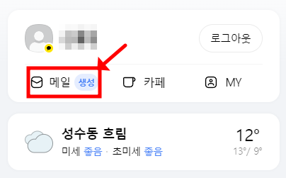 먼저, 기본적으로 다음 홈페이지에 메일 서비스가 어디에 위치해있는지 부터 알려드리도록 하겠습니다. 메인 화면의 최상단 검색창 바로 하단에 아이콘과 함께 '메일'이라고 적혀있는 버튼이 보입니다. 최근에 홈페이지 UI가 전체적으로 변경이 되었습니다. 그로 인해 위치가 익숙하지 않으신 분들이 있으실 듯하여 먼저 알려드립니다.