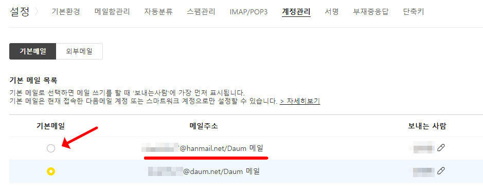 - 한메일 주소 사용하기 : 메일함의 '설정'을 눌린 뒤, "계정 관리"에 들어가시면 기본메일을 hanmail.net으로 설정하실 수 있습니다.