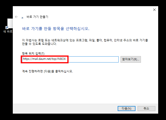 - '항목 위치 입력(T)' 란 아래에 https://mail.daum.net/top/INBOX 를 입력 후 '다음'