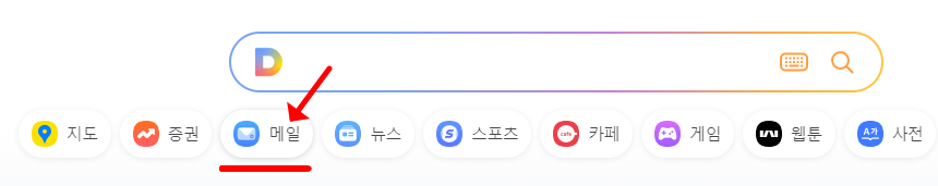 먼저, 기본적으로 다음 홈페이지에 메일 서비스가 어디에 위치해있는지 부터 알려드리도록 하겠습니다. 메인 화면의 최상단 검색창 바로 하단에 아이콘과 함께 '메일'이라고 적혀있는 버튼이 보입니다. 최근에 홈페이지 UI가 전체적으로 변경이 되었습니다. 그로 인해 위치가 익숙하지 않으신 분들이 있으실 듯하여 먼저 알려드립니다.
