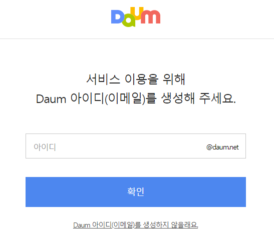 다음 메일을 이용하시려면 Daum 아이디가 필요합니다. 오래전부터 다음 메일 바로가기 서비스를 이용하고 계셨던 분이라면 이 절차는 생략하고 다음 순서로 넘어가시면 됩니다. 이 단계는 Kakao 아이디만 가지고 있거나, 과거 다음 아이디와 카카오톡 아이디를 통합하지 않은 분들에게 필요한 절차입니다. 후자에 속하신다면 다음에 로그인 하신 뒤, 다음 메일을 생성해주세요.