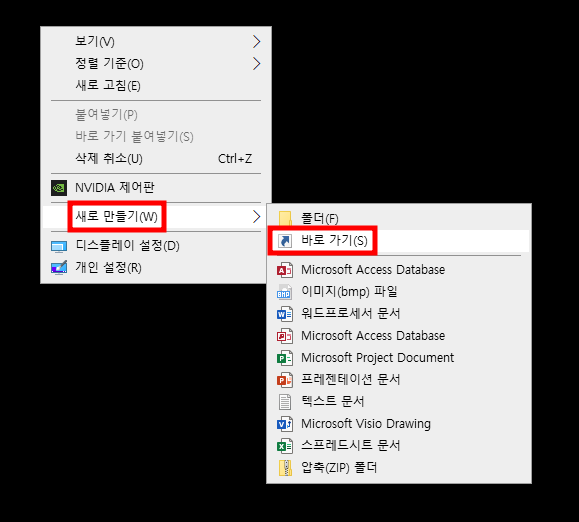 - 바탕화면 빈 공간 아무곳에서 마우스 오른쪽 클릭