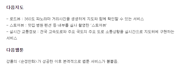 다음은 1995년에 설립된 대한민국의 초기 인터넷 기업 중 하나로, 인터넷 포털 사이트로서 사용자에게 다양한 온라인 서비스를 제공하기 시작했습니다. 2014년에는 국내 최대 모바일 플랫폼인 카카오와 합병하여 새로운 시너지를 창출하였고, 이를 통해 더 넓은 서비스 범위와 기술적 발전을 이루어내고 있는 중입니다.