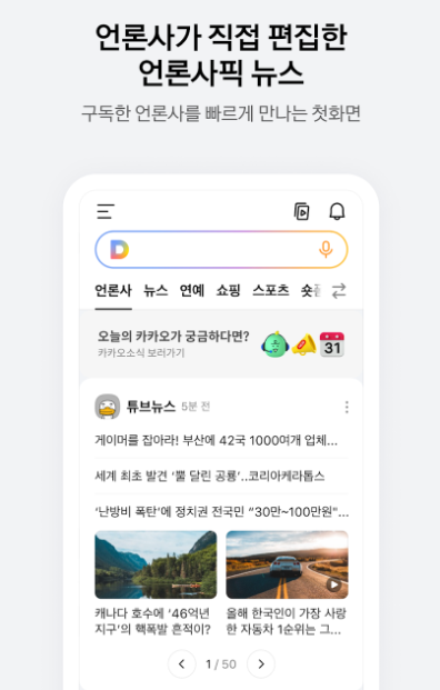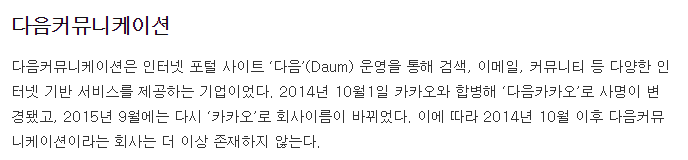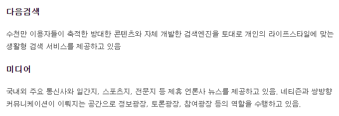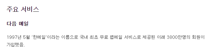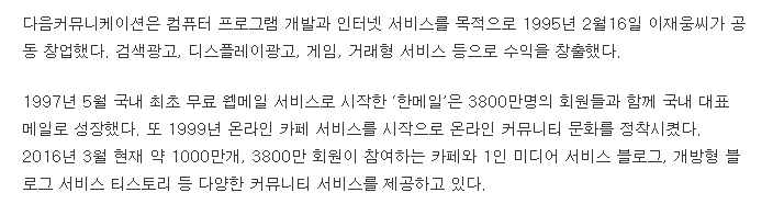 다음은 1995년에 설립된 대한민국의 초기 인터넷 기업 중 하나로, 인터넷 포털 사이트로서 사용자에게 다양한 온라인 서비스를 제공하기 시작했습니다. 2014년에는 국내 최대 모바일 플랫폼인 카카오와 합병하여 새로운 시너지를 창출하였고, 이를 통해 더 넓은 서비스 범위와 기술적 발전을 이루어내고 있는 중입니다.