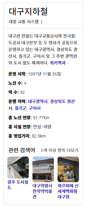*참고 자료 및 이미지 출처 : 위키백과, 카카오맵, 카카오지하철, 대구, 인천교통공사 홈페이지