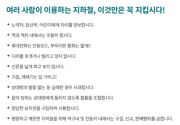 대구 지하철 노선도 시간표 이야기는 이쯤으로 하도록 하고, 마지막으로 대구 도시철도를 이용할 때 지켜야 할 에티켓에 대해 말씀드리겠습니다. 승하차 시 질서를 지키고, 노약자석은 필요한 분들에게 양보해주세요. 전화 통화나 음악 감상 시 소음에 주의하고, 음식물 섭취는 삼가는 것이 좋습니다. 이러한 에티켓을 지키면 모두가 편안하게 이용할 수 있는 대중교통 문화를 만들 수 있을 것 같습니다.