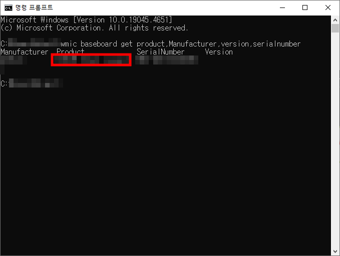 - 명령 프롬프트에서 wmic baseboard get product,Manufacturer,version,serialnumber 명령을 입력합니다.
