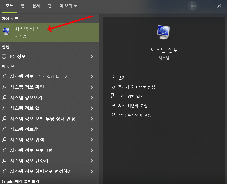- Windows 검색창에서 '시스템 정보'를 검색하여 실행해주세요.