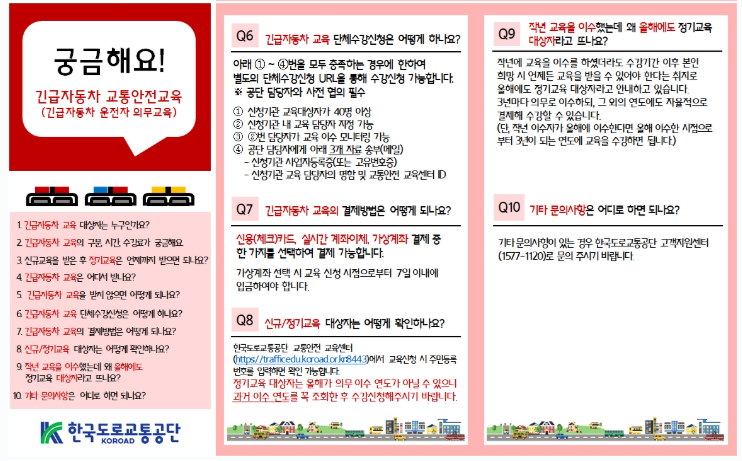 이곳에서 제공하는 교육은 단순히 지식 습득을 넘어 법적 의무 이행과 자격 유지에 반드시 필요합니다. 예를 들어, 어린이 통학버스 동승보호자 교육은 도로교통법에 따라 도로교통공단 교통안전교육센터 홈페이지 바로가기에서 강의 교육을 필수로 이수해야 하며, 교육을 마치면 공식 수료증이 발급되어 법적 기준을 충족할 수 있습니다. 고령운전자 교육 역시 운전면허 갱신 시 필수이며, 긴급자동차 운전자 교육은 해당 업무에 종사하는 사람이 정기적으로 이수해야 하는 법적 의무 교육입니다. 교육을 수료하면 공식 인증 수료증이 발급되어, 업무 수행이나 자격 유지에 반드시 필요합니다