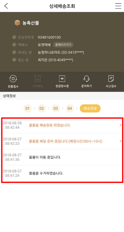 - '배송조회' 화면에서 물품정보 및 배송정보(상태)를 확인합니다.