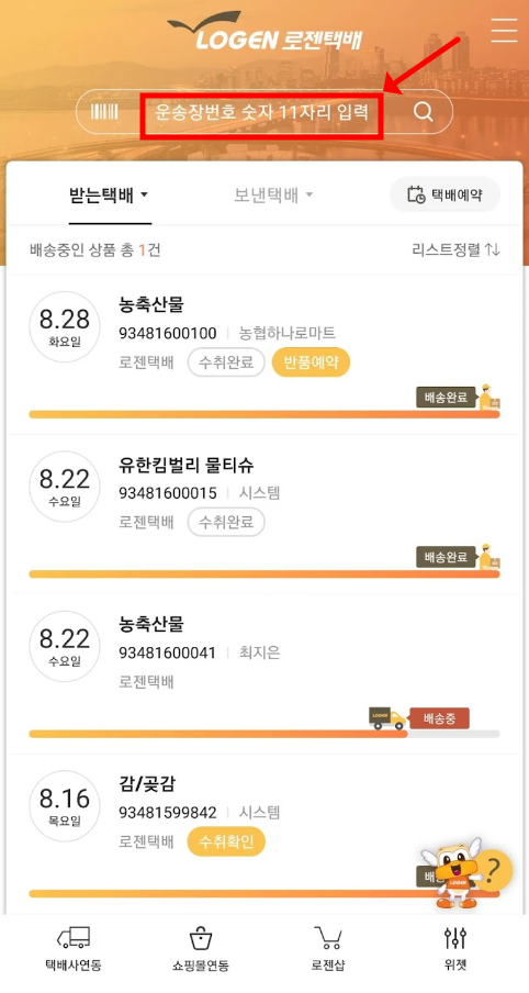 - 택배조회 검색창에 운송장 번호를 입력하세요.