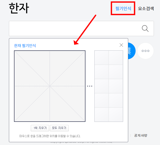 썸네일을 통해 접속 하셨다면, 위와 같은 화면이 나옵니다. 다음 무료 한문 번역기 사이트의 이용법을 간략하게나마 소개해드리도록 하겠습니다. 먼저 우리가 궁금한 한자가 있을 때 어떻게 검색해야 되는지 부터 막막하죠. 하지만 "필기 인식" 기능을 활용하면 매우 쉽게 한문을 검색하실 수 있어요.